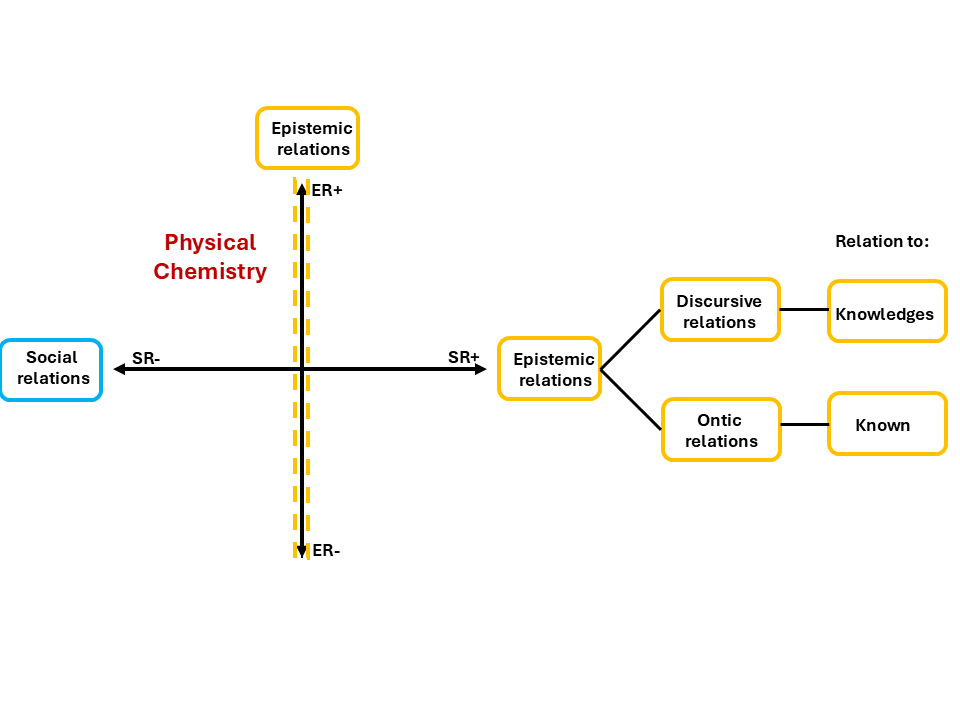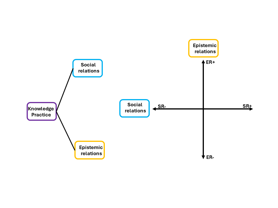 Before we go deeper, it helps to see the full picture first. Figure 2 shows how any knowledge practice, including Physical Chemistry, can be understood through two organising principles. On the left, you can see that a knowledge practice branches into two directions: social relations (the blue branch) and epistemic relations (the gold branch). On the right, those two branches become the axes of a plane. The vertical axis is epistemic relations, from weaker (ER−) at the bottom to stronger (ER+) at the top. The horizontal axis is social relations, from weaker (SR−) on the left to stronger (SR+) on the right. Where a discipline sits on that plane tells you what it values most.