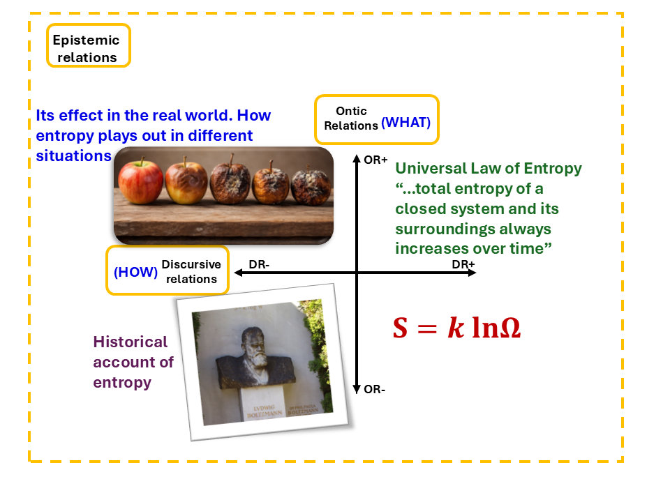 What Physical Chemistry actually requires is the upper-right quadrant, the purist insight. This means holding the object and the method together at the same time. For entropy, it means the Universal Law, the total entropy of a closed system and its surroundings always increases over time, held together with S=klnΩ in a way that makes the equation an act of physical reasoning, not just a formula to recall. Maton and Howard (2021) call this ontic condensation, the physical meaning becomes genuinely carried inside the formal representation. At the purist level, S=klnΩ is more than a formula, understanding it requires grasping the meaning of Ω, Boltzmann’s rationale for the logarithm, and the way this expression describes physical reality as an integrated whole. The formalism and the physical reality are not two separate things that happen to sit next to each other. They are fused, which makes it hard to reach, and harder still when nobody builds the pathway to get there.